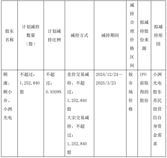 小洲光电系公司持股平台,本次股份减持为小洲光电股东苏民投君信(上海)产业升级与科技创新股权投资合伙企业(有限合伙)(以下简称“苏民投君信”)自身资金需求。公司已收到实际控制人顾康、顾小舟及通过小洲光电间接持有公司股份的董事、监事、高级管理人员出具的《关于不参与本次小洲光电减持事项的承诺函》,上述人员通过小洲光电持股平台间接持有公司股份的部分不参与本次股份减持。