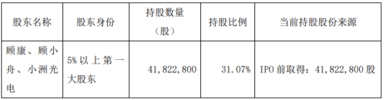 截至公告披露日,顾康、顾小舟及其控制的小洲光电合计持有澳华内镜41,822,800股,占公司总股本的31.07%。其中小洲光电持有公司股份3,132,100股,占公司总股本的2.33%;顾康持有公司股份16,950,200股,占公司总股本的12.59%;顾小舟持有公司股份21,740,500股,占公司总股本的16.15%。上述股份来源均为公司首次公开发行前取得的股份,且已于2024年11月15日起上市流通。