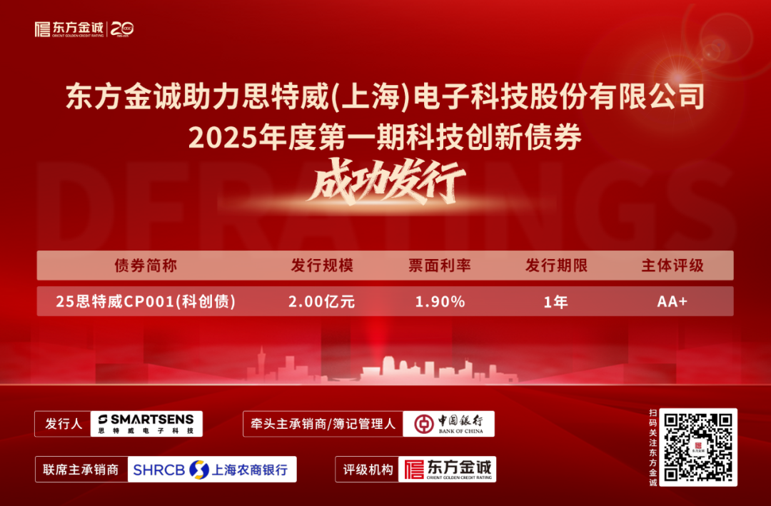 近日,东方金诚助力“思特威(上海)电子科技股份有限公司2025年度第一期科技创新债券”(以下简称“本期债券”)在银行间债券市场成功发行。本期债券发行规模2.00亿元,发行期限1年,当期票面利率1.90%。