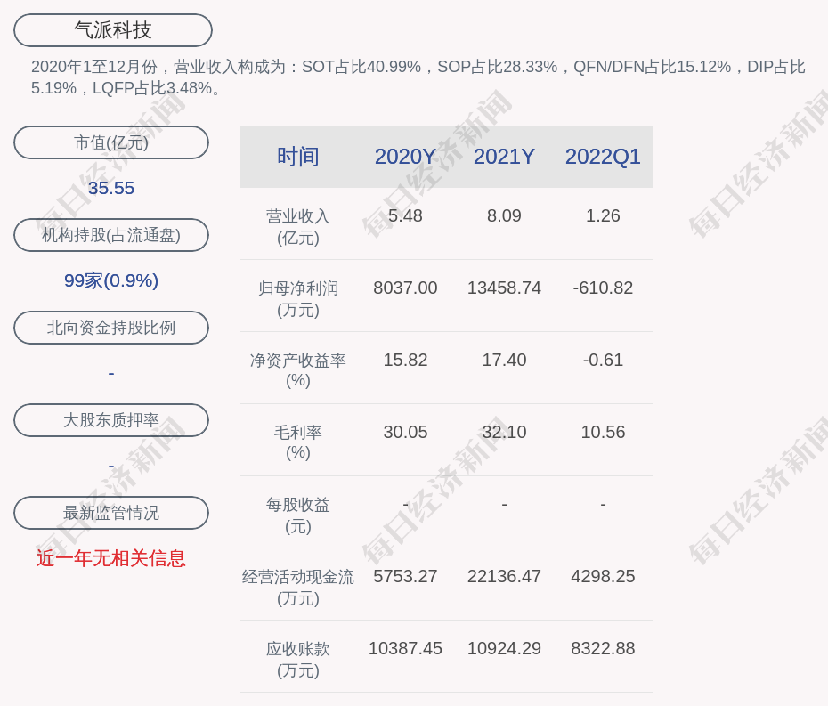 2020年1至12月份,气派科技的营业收入构成为:SOT占比40.99%,SOP占比28.33%,QFN/DFN占比15.12%,DIP占比5.19%,LQFP占比3.48%。