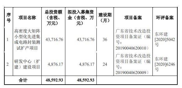 气派科技的募集资金总额为3.94亿元,募集资金净额为3.38亿元,较原拟募资少1.48亿元。气派科技此前披露的招股书显示,公司拟募资4.86亿元,分别用于“高密度大矩阵小型化先进集成电路封装测试扩产项目”、“研发中心(扩建)建设项目”。