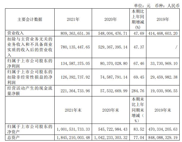 2021年,气派科技营业收入8.09亿元,同比增长47.69%;归属于上市公司股东的净利润1.35亿元,同比增长67.46%;归属于上市公司股东的扣除非经常性损益的净利润1.26亿元,同比增长69.45%;经营活动产生的现金流量净额2.21亿元,同比增长284.76%。