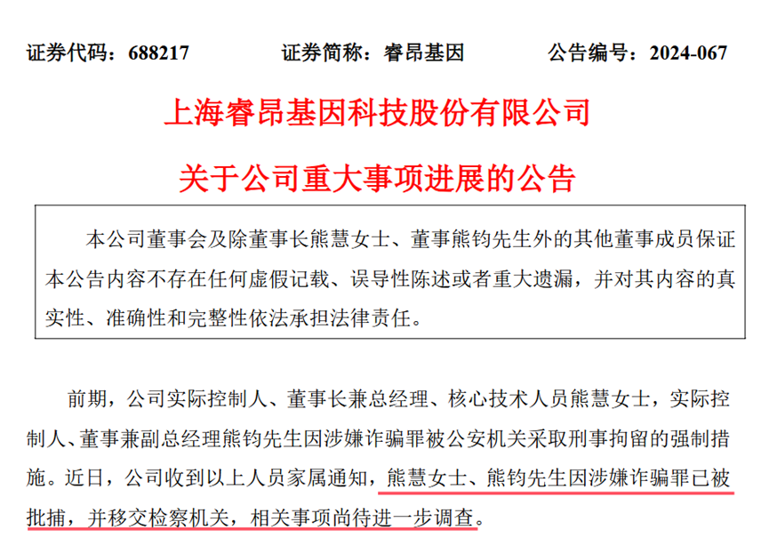 12月5日,“肿瘤检测龙头”睿昂基因发布公告称,熊慧、熊钧,因涉嫌诈骗罪被已被批捕,并移交检察机关,相关事项尚待进一步调查。