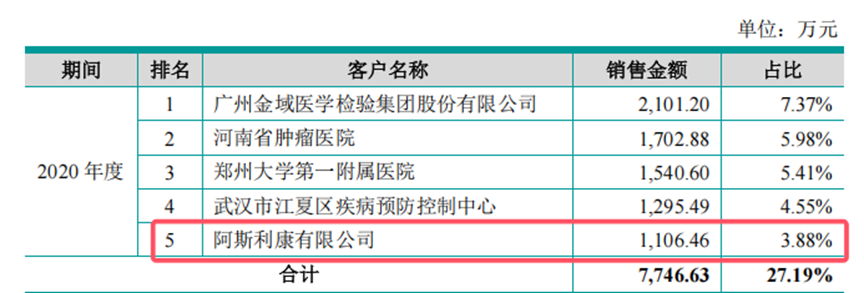 根据《招股书》,2020年,阿斯利康位列睿昂基因前五大客户名单,为后者贡献了1106.46万元收入,双方合作内容为EGFR-T790M液体活检服务,而该服务正好是用于检测与泰瑞沙治疗相关的靶向基因突变情况。