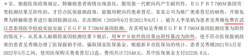 在部分判决书中,武汉思泰得实验室被指存在大量检测报告与医保中心报备结果不一致的情形。尽管该实验室并未被直接指控为篡改或编造基因检测报告,但其被阿斯利康的医药代表视为官方合作伙伴,允许患者在此免费接受基因检测。