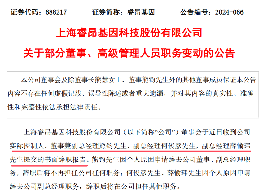 另一公告中,睿昂基因三名涉案高管均辞职,其中熊钧先生因个人原因申请辞去公司董事、副总经理职务,辞职后将不再担任公司任何职务;何俊彦先生、薛愉玮先生因个人原因申请辞去公司副总经理职务。