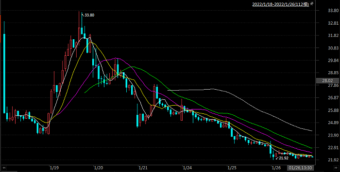 翱捷科技于2022年1月14日上市,IPO首发价为164.54元/股;但该公司股价于上市首日以130元/股开盘,当日仍大跌33.75%。1月26日,翱捷科技股价再跌3.43%至91.91元/股,较发行价下跌超44%。