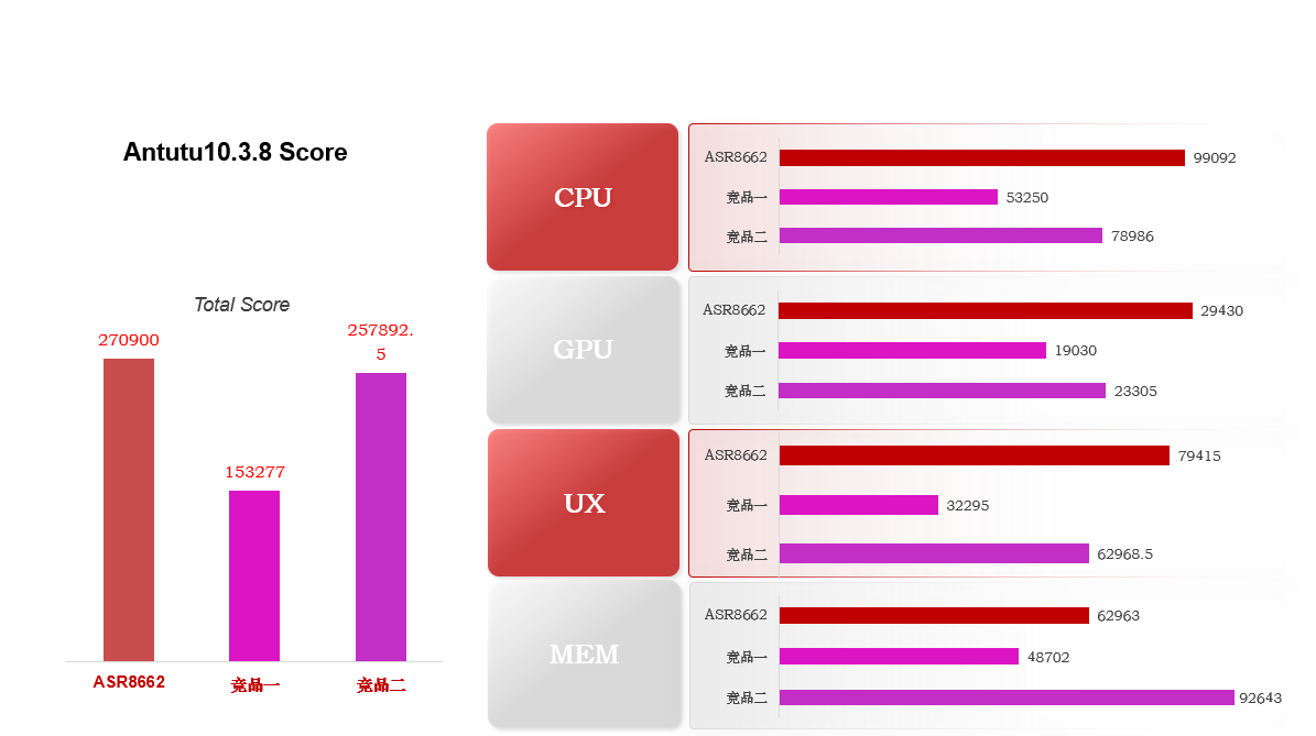 根据Antutu测试数据来看,ASR866X系列的总体性能领先竞品,且兼具性价比的优势。