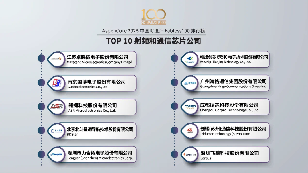 在本次峰会上,翱捷科技还荣登 ASPENCORE 2025 中国 IC 设计 Fabless100 排行榜,并位列“射频及通信芯片公司Top10”,体现了业界对翱捷科技创新能力和市场影响力的高度认可。未来,翱捷科技将继续深耕无线通信领域,以优质的芯片解决方案赋能全球智能互联,加速 5G 及未来 6G 时代的数智化变革,推动蜂窝通信技术迈向新的高度。