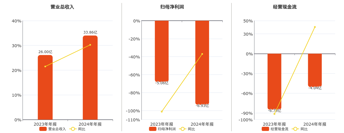 公司营业总收入为33.86亿元。归母净利润为-6.93亿元,较去年同报告期归母净利润减少1.87亿元。经营活动现金净流入为-4.04亿元。