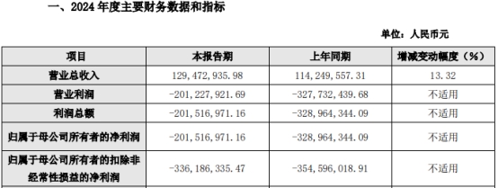 2023年,公司实现营业收入1.14亿元,同比增长34.82%;归母净利润为-3.29亿元,上年同期为-3.57亿元;扣非净利润为-3.55亿元,上年同期为-3.99亿元;经营活动产生的现金流量净额为-2.67亿元,上年同期为-2.89亿元。