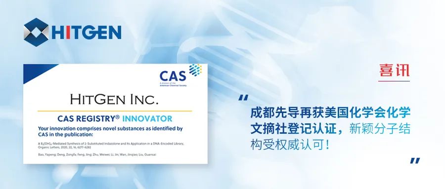 2021年4月,成都先导首次获得“CAS REGISTRY? INNOVATOR”证书,由成都先导与FORMA的科学家团队合作完成的名为《Synthesis of Multifunctional 2?Aminobenzimidazoles on DNA via Iodine-Promoted Cyclization》的文献中,共计86个新颖化合物获得“CAS Registry Number?”。该篇文献于2020年1月30日发表于《Organic Letters》。