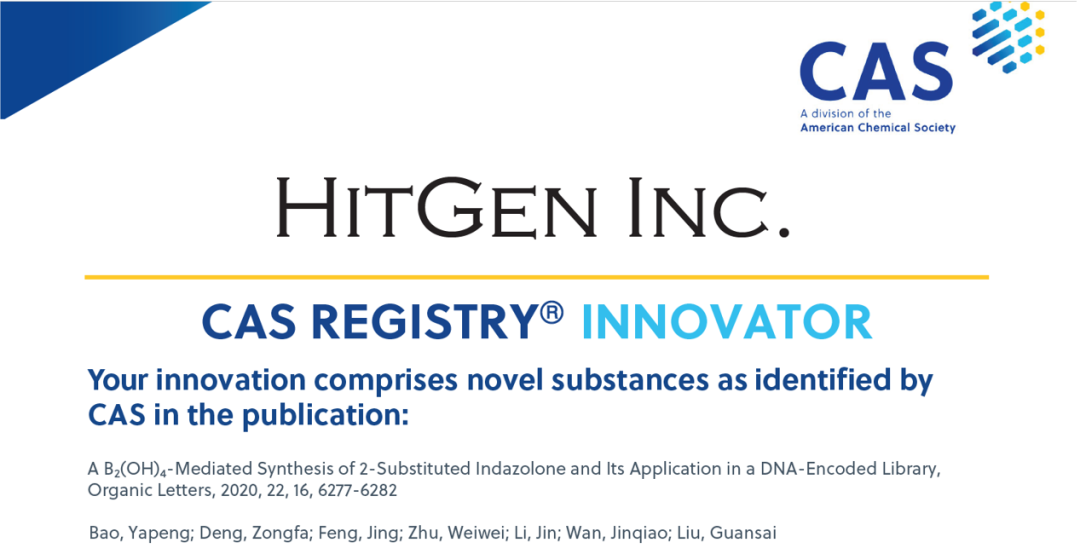 近日,成都先导药物开发股份有限公司(以下简称“成都先导”)再次荣获美国化学会(American Chemical Society,ACS)下设的化学文摘社(Chemical Abstract Service,CAS)颁发的“CAS REGISTRY? INNOVATOR”证书,共计91个新颖化合物被赋予独有的“CAS Registry Number?”。这是对成都先导所发表的学术文献中的分子结构的新颖性以及合成方法的创造性的认可。该篇名为《A Novel B2(OH)4-Mediated Synthesis of 2-Substitued Indazolone and Its Application in DNA-Encoded Library》的文献于2020年8月1日发表于《Organic Letters》,由成都先导的科学家团队独立完成。