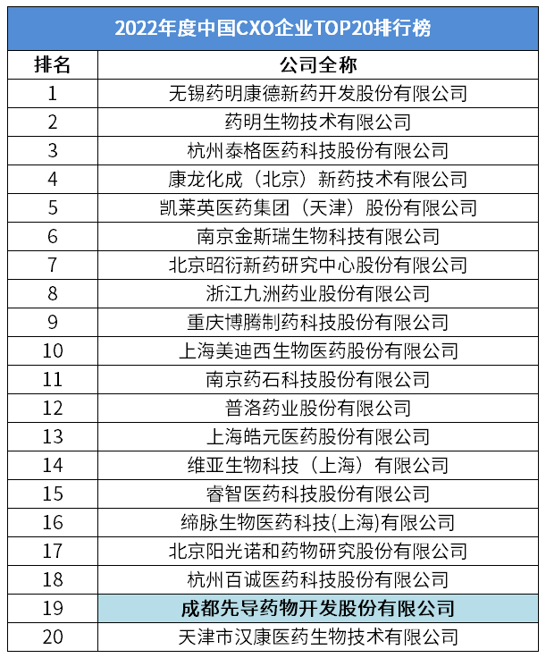 成都先导荣登“中国CXO企业TOP20排行榜”