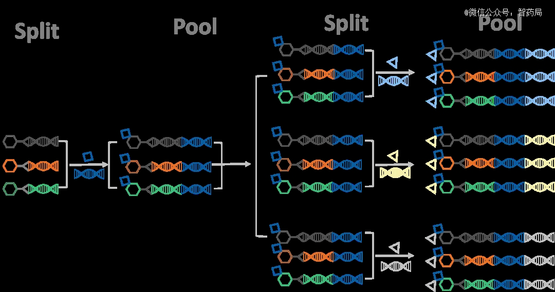DNA 编码化合物库依赖于组合化学与DNA 技术两大基础,通过均分与合并,在为骨架分子增加化学反应单元的过程中,使得化合物数量急剧增加,从而构建起亿级乃至千亿级的巨型化合物库。