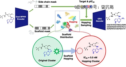 以成都先导与腾讯AI Lab「云深」平台合作设计的骨架跃迁分子生成算法(GraphGMVAE)为例,该算法能在保持分子侧链不变的情况下,能有效生成具有相似生物活性但骨架不同的分子,从而减少人力以及时间成本。