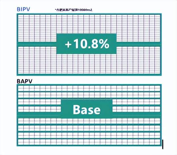 合肥某客户屋顶10000m2屋顶面积进行实际测算分析发现,考虑屋面实际情况和排布,BIPV无需预留运维通道,同等面积下比BAPV装机容量增加10.8%,