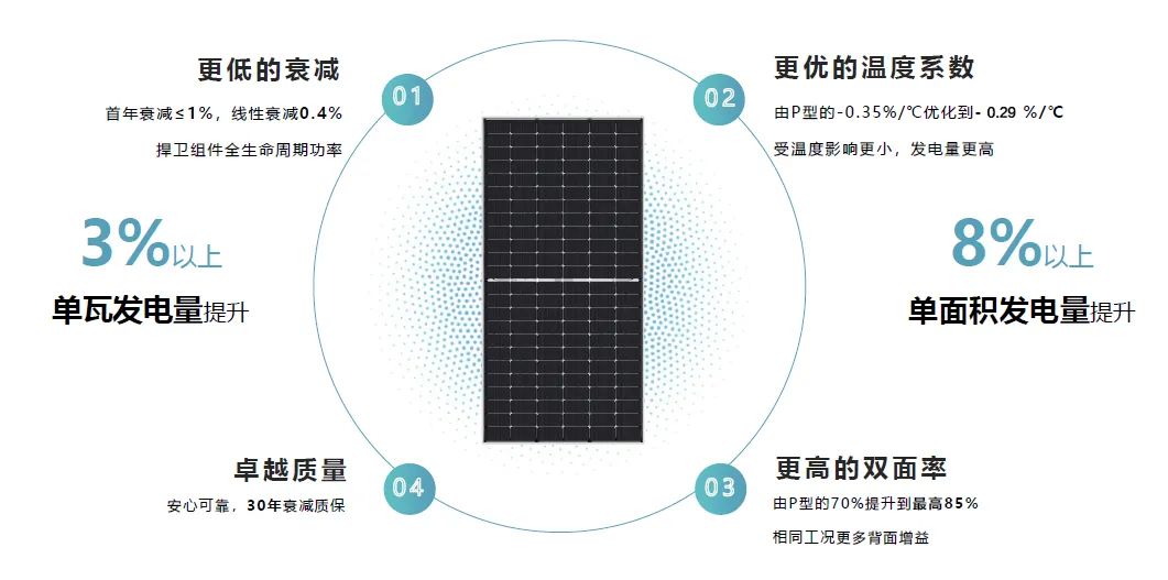 晶科N型组件,以其先进的TOPCon技术领跑行业,拥有高转化效率、高双面率、高发电量、低衰减、低温度系数等卓越优势,其领先地位已成共识。