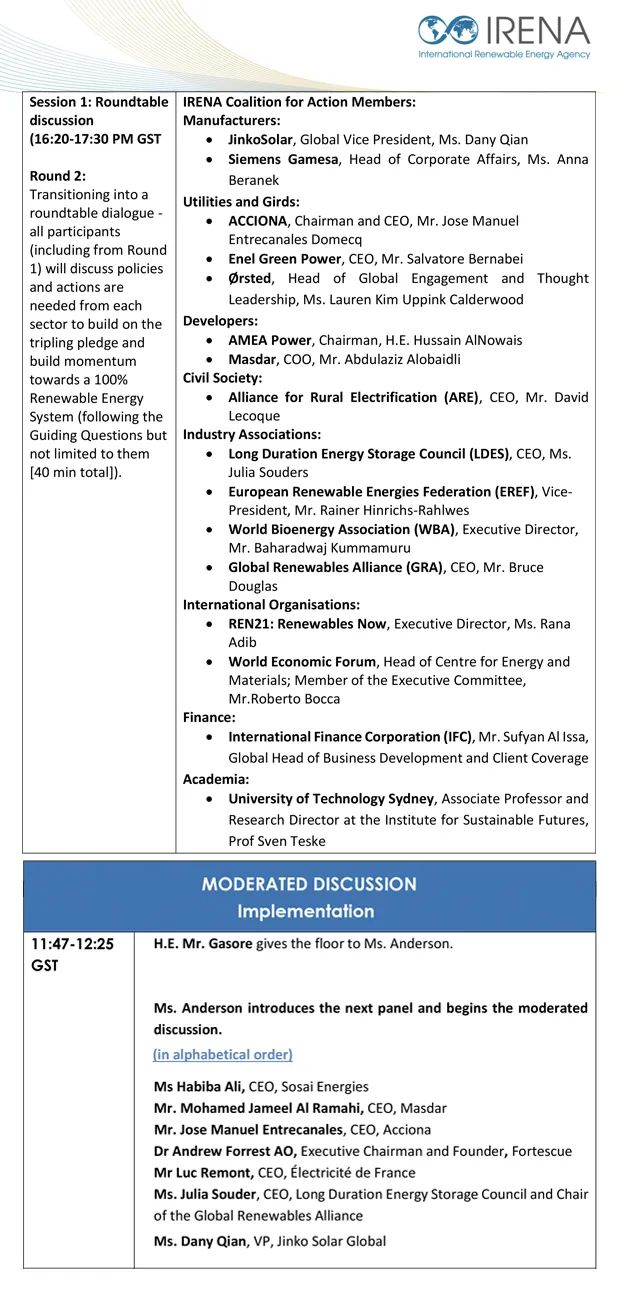 同期,晶科能源还在4月16日的IRENA行动联盟圆桌会议上,与EDF、ACCIONA、Masdar、Sosai、Fortescue呼吁全球应加速出台促进新能源投资、发展和消纳的引导政策,并建立完善的新能源市场机制。