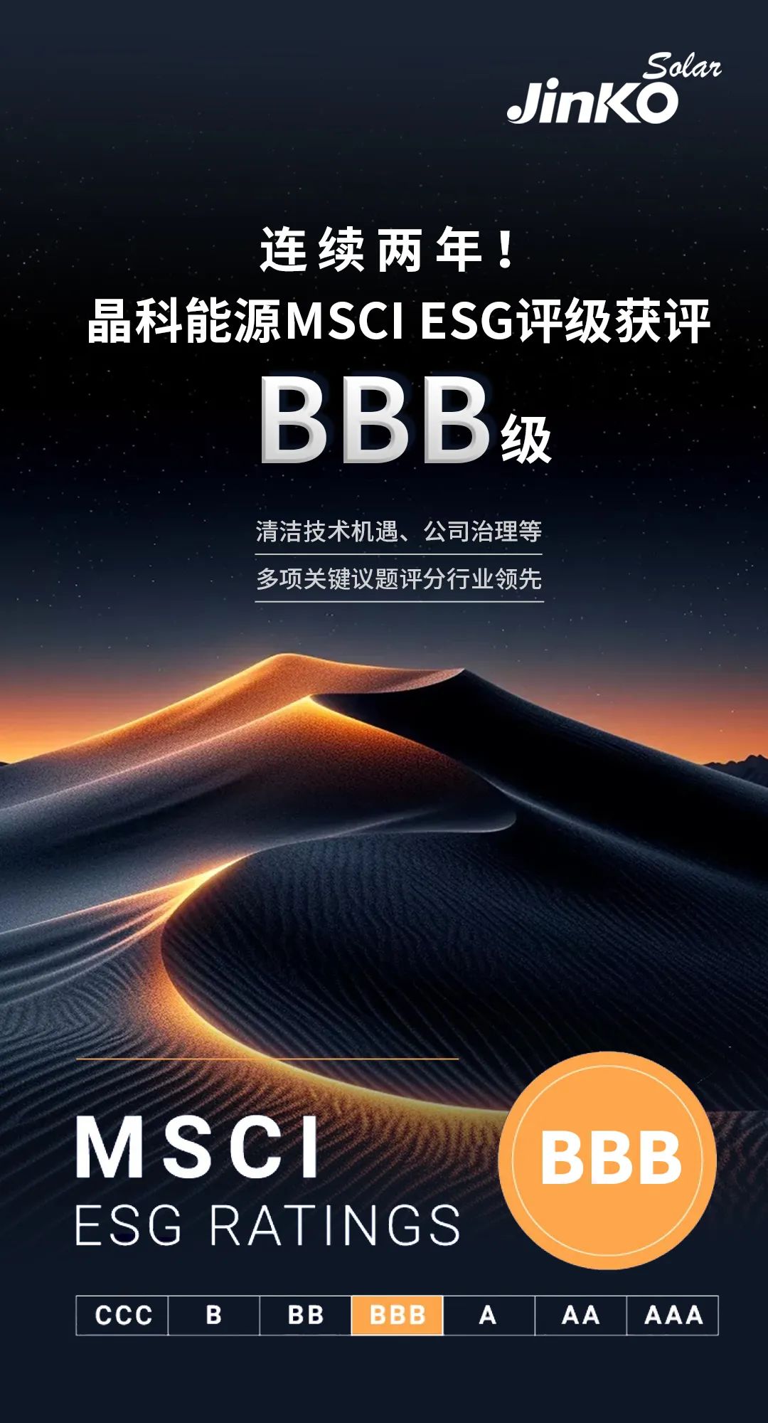 近日,国际权威指数机构MSCI(明晟)发布晶科能源2024年ESG评级结果,凭借在ESG领域的卓越表现,晶科能源连续两年评级得分BBB级。同时,在清洁技术机遇、公司治理、企业行为等多项关键议题评分处于行业领先水平。