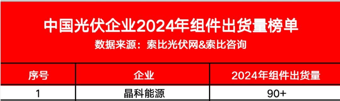 出货量方面,据1月17日索比光伏网&索比咨询发布的榜单。晶科能源以90+GW的出货量问鼎冠军。这意味着,在2023年重回组件出货量全球第一之后,这家巨头再次蝉联这一光伏行业的“铁王座”。