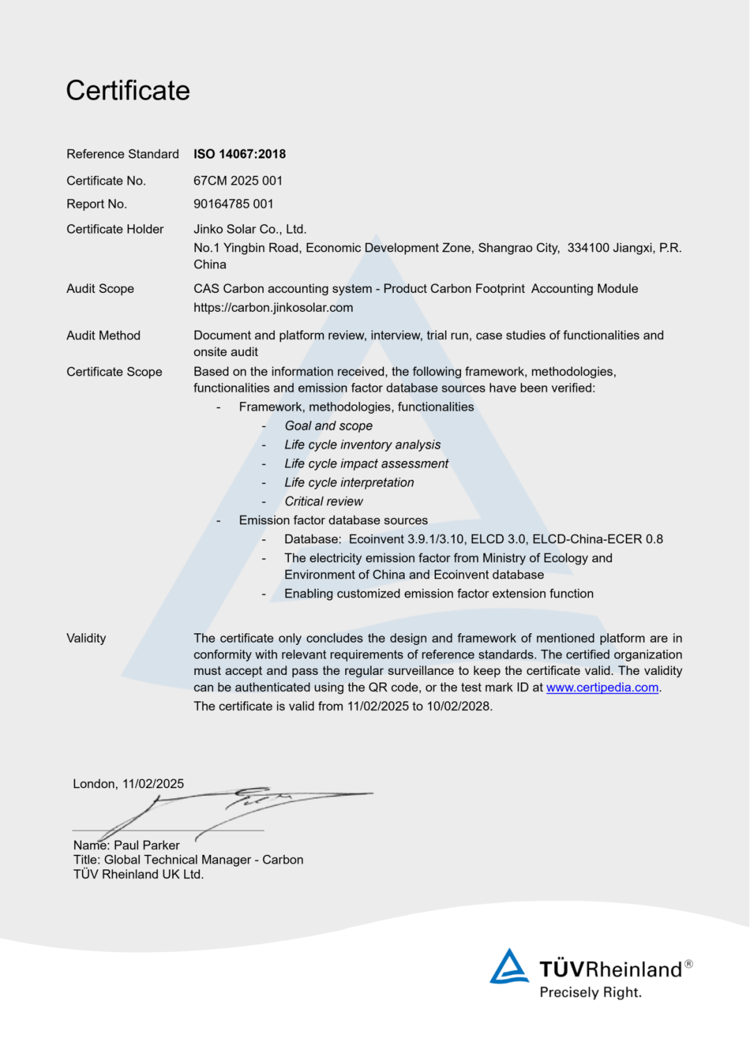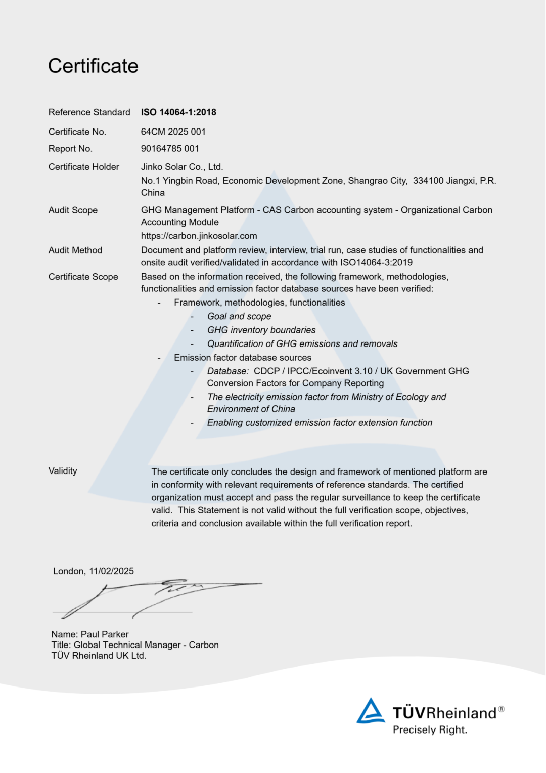 此次认证TüV莱茵对系统所涉及数据的相关性、完整性、准确性,排放源识别、排放系数选择与维护,以及计算逻辑合理性等多个方面进行了严格评估,最终确认晶科碳管理系统与国际温室气体核算标准高度契合。