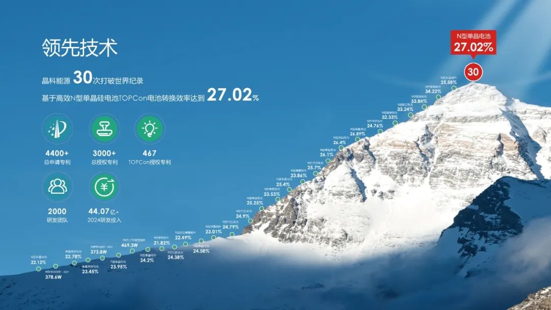 近日晶科能源公告,其自主研发的N型TOPCon高效光伏组件,经第三方权威机构TüV南德测试认证,最高转化效率达到了25.58%,再次刷新了全球同类组件效率新的纪录。同时,晶科能源182N型高效单晶硅电池(TOPCon)转换效率经国家光伏产业计量测试中心第三方测试认证,全面积电池转换效率达到27.02%,创造了大面积N型单晶钝化接触(TOPCon)电池转换效率新的纪录。