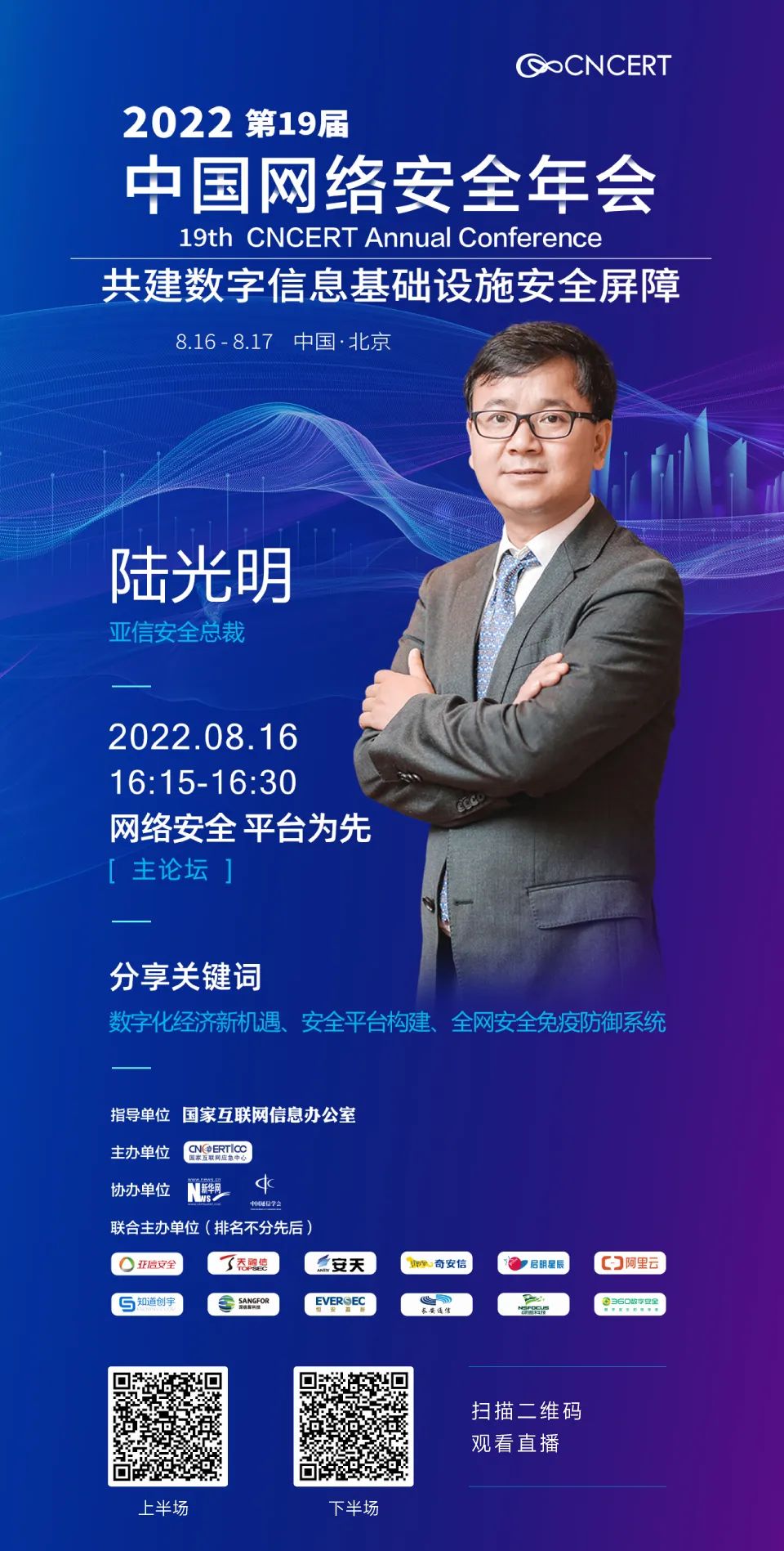 本次活动在国家互联网信息办公室指导下,由国家互联网应急中心(CNCERT/CC)主办,并联合亚信安全等众多厂商共同举办。亚信安全总裁陆光明,将受邀在主论坛进行题为《网络安全,平台为先》的主题演讲,解读数字化经济新机遇、分析安全平台化发展、展望全网安全免疫建设。