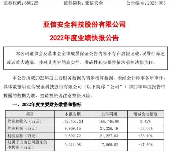 2月28日,亚信安全(688225)发布2022年度业绩快报,公告显示,2022年度营业总收入为172,451.24万元,比上年同期增长3.42%;归属于上市公司股东的净利润为9,311.08万元,比上年同期下滑47.89%。