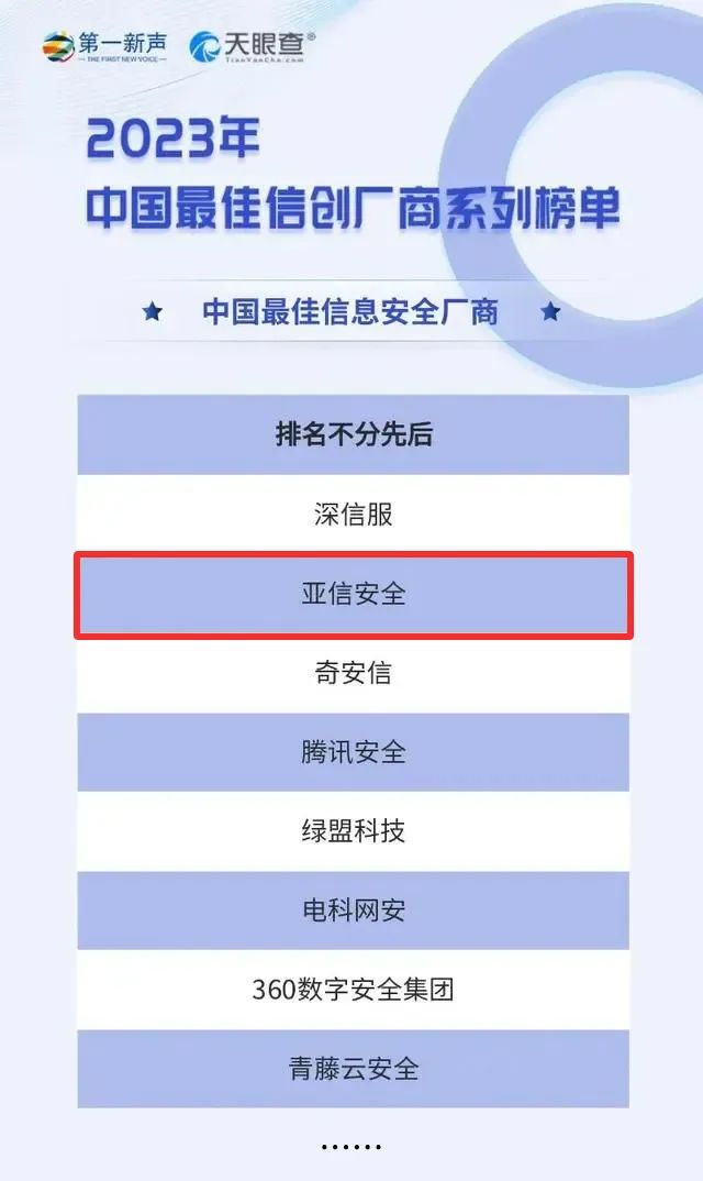 近日,“第一新声”联合“天眼查”共同发布《2023年中国最佳信创厂商》系列榜单,亚信安全凭借在信创安全领域的突出技术,实力入选“中国最佳信息安全厂商”榜单。