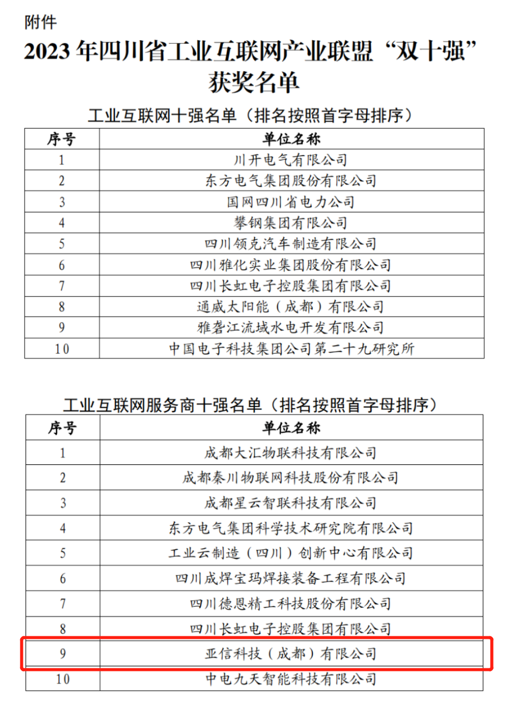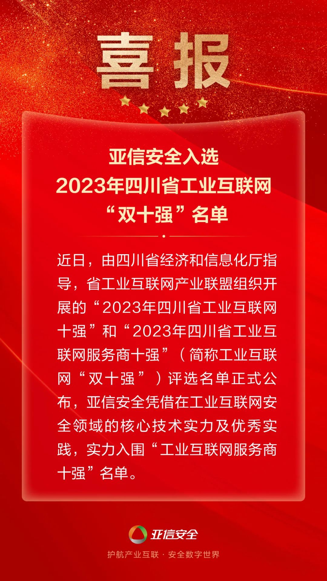 近日,由四川省经济和信息化厅指导,省工业互联网产业联盟组织开展的“2023年四川省工业互联网十强”和“2023年四川省工业互联网服务商十强”(简称工业互联网“双十强”)评选名单正式公布,亚信安全凭借在工业互联网安全领域的核心技术实力及优秀实践,实力入围“工业互联网服务商十强”名单。