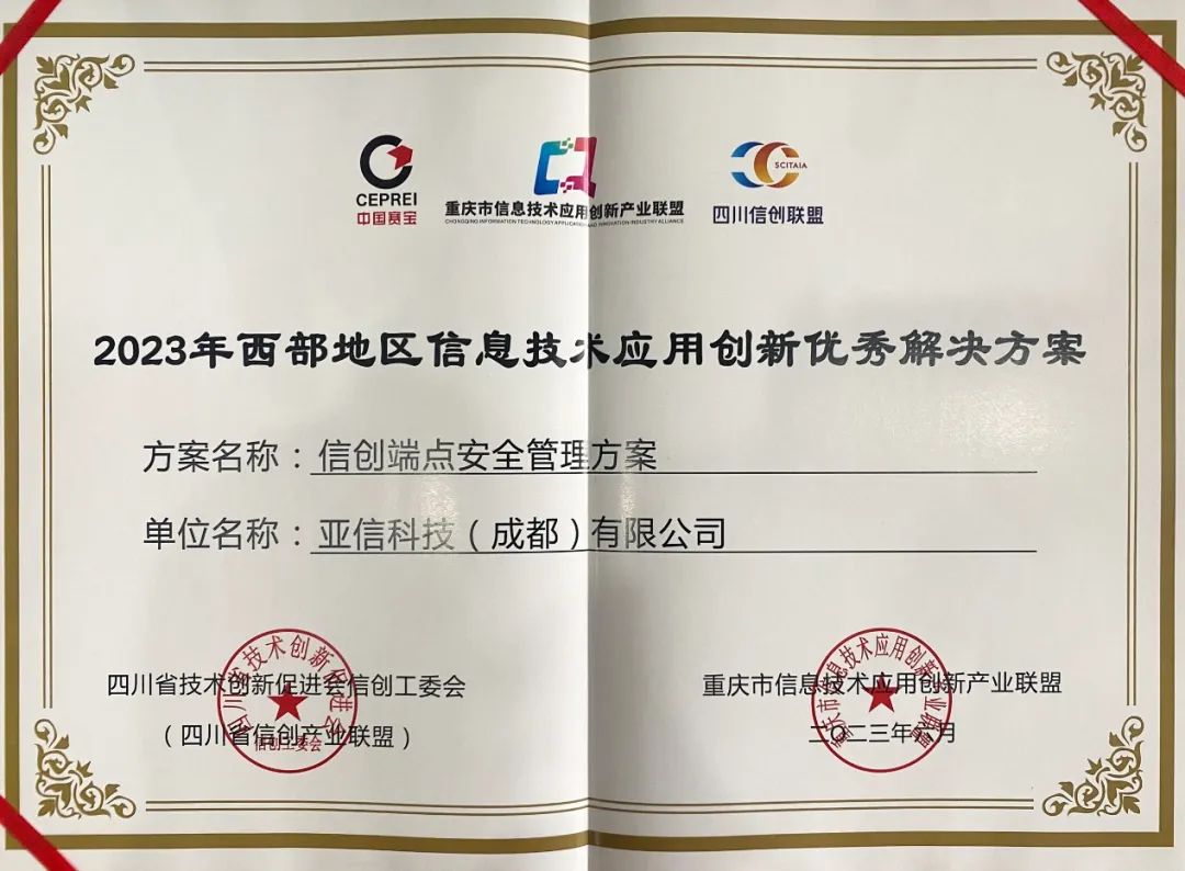 近日,在中共重庆市委网络安全和信息化委员会办公室、重庆市经济和信息化委员会、重庆市大数据应用发展管理局、重庆市沙坪坝区人民政府、四川省经济和信息化厅共同指导下,由工业和信息化部电子第五研究所主办的“2023西部信息技术应用创新产业生态大会”在重庆举办。会上,亚信安全信创端点安全管理方案荣获“西部信息技术应用创新优秀解决方案”。