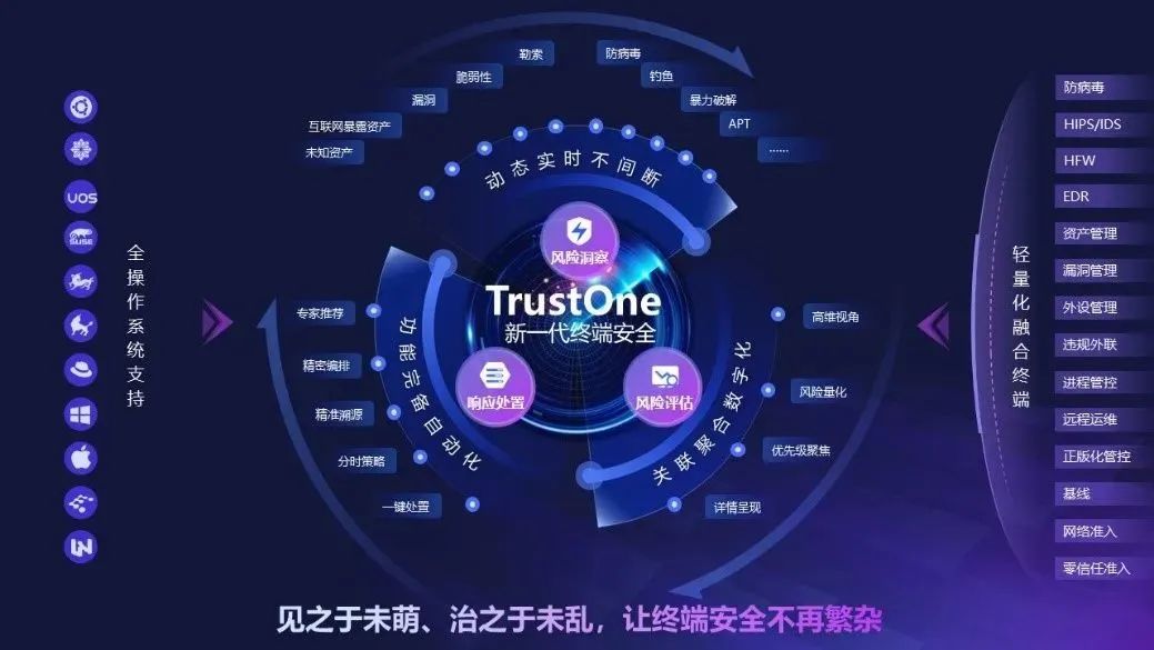 TrustOne的极简新主义适用于攻击面管理、攻击防护、运维管控等各个场景,精准对标数字变革需求,让用户的数字安全能力获得进阶。未来,亚信安全将把握时代赋予的机遇,用终端安全的进化之道,筑牢数字时代下产业发展的安全底座。