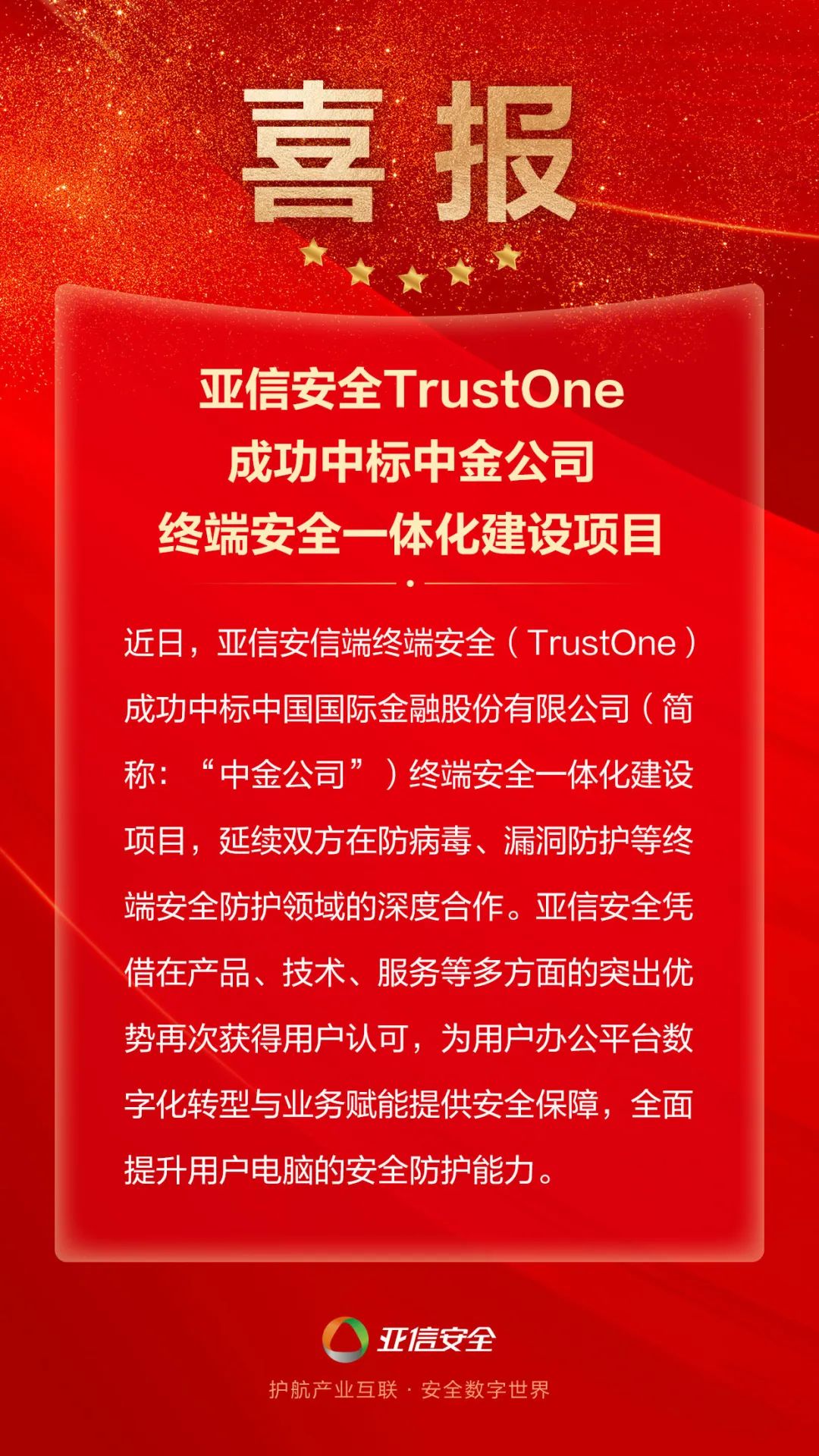 喜报!亚信安全TrustOne成功中标中金公司终端安全一体化建设项目
