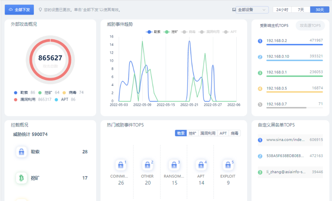 此时,借助亚信安全ImmunityOne 的防毒墙能力,通过深度数据包检测针对服务器与终端的漏洞攻击,在安装补丁前屏蔽漏洞,阻止已知漏洞被无限利用,大大减少服务器与终端面临漏洞攻击的风险,保护易受攻击的应用程序和操作系统,有效防范已知攻击和Nday攻击入侵。