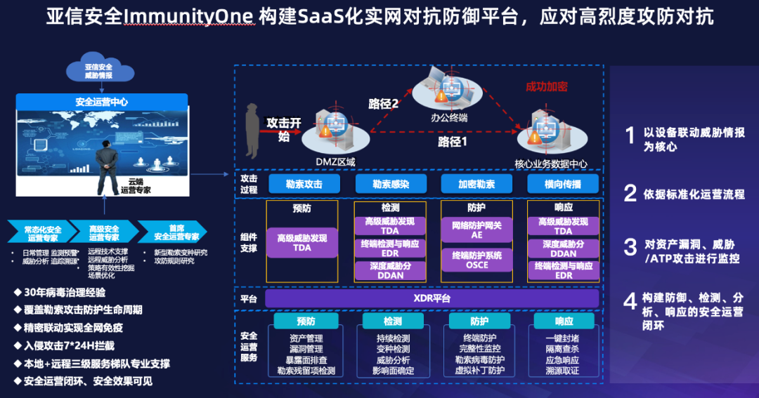 “知攻”方能“善防”,亚信安全ImmunityOne SaaS化平台的检测能力以MITRE的ATT CK框架攻击模型为设计前提,平台以设备联动威胁情报为核心,依据标准化运营流程,通过运营组件对资产的漏洞、威胁、APT攻击进行监控,从而构建防御、检测、分析、响应的安全运营闭环,构建面向实战的安全防护体系,实现对入侵威胁的及时响应与防御。