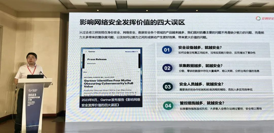 9月11日- 13日,由中国交通报社和中国交通运输协会联合主办的“2023中国北京数字交通大会暨博览会”在北京隆重举办。本次大会以“数字·新时代、交通·新未来”为主题,汇聚数字交通领域“政、商、产、学、研、用”各界领导、专家,凝聚数字交通建设力量,展现数字交通最新发展成果。大会设立1场开幕式暨主论坛、10场平行论坛和1个主题展览。亚信安全作为网络安全行业优秀企业代表受邀出席网络安全创新发展论坛,分享安全战略发展趋势,强调构建业务优先、数据融合的安全能力体系。