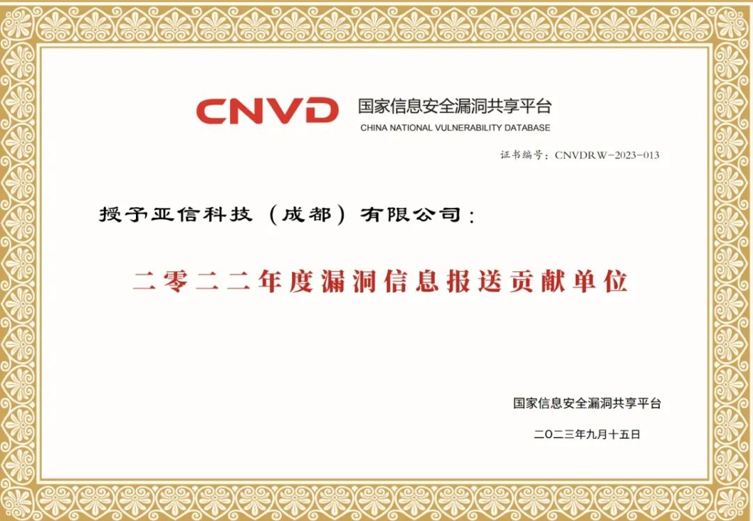 近日,CNVD发布2022年度CNVD支撑单位年度工作情况及优秀单位个人表彰名单。依照《国家信息安全漏洞共享平台(CNVD)支撑单位能力评价》办法,通过综合考量企业提交情况和平台统计数据,从漏洞收集工作、漏洞发现工作、漏洞威胁风险大数据工作、漏洞技术分析工作、重大漏洞事件响应工作和集体任务协作六个能力象限,对支撑单位的年度工作情况进行了统计和评价,亚信安全凭借突出的漏洞上报贡献能力,获评CNVD“2022年度漏洞信息报送贡献单位”。