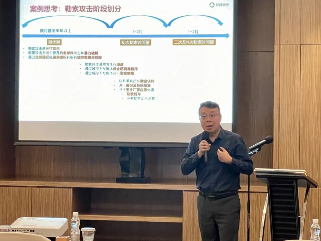 在分析真实的勒索攻击案例时,亚信安全SaaS业务部总监徐江明指出,在不同勒索攻击阶段有与之对应的防护策略,有两点关键要义,一是强化威胁数据的分析、挖掘以及共享,做到“早发现”、“早诊断”、“早处置”;二是通过NDR+EDR立体监控监测“勒索残存”,向勒索团队说“不”。