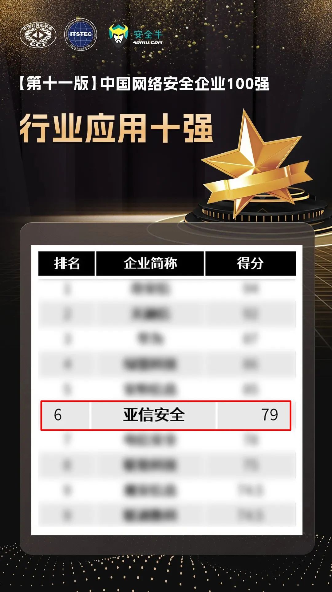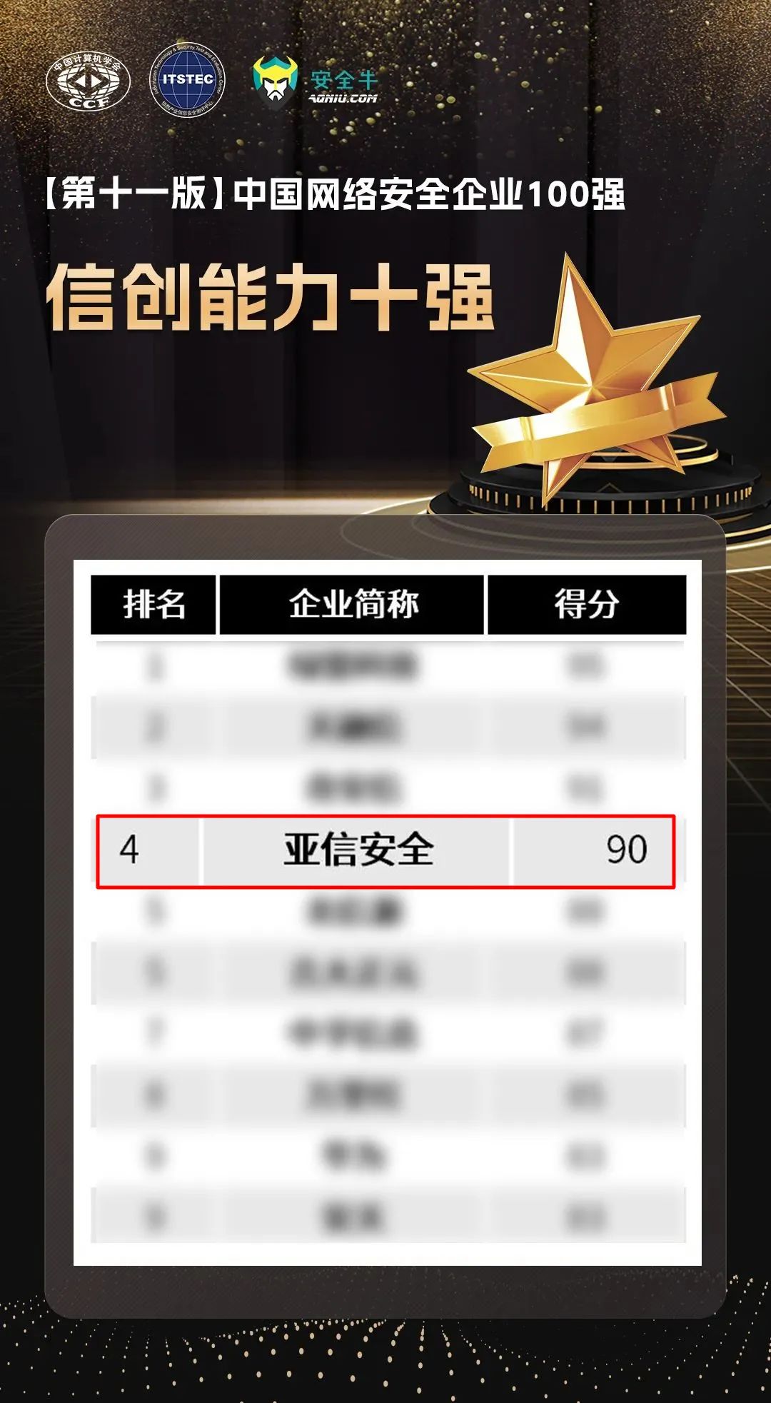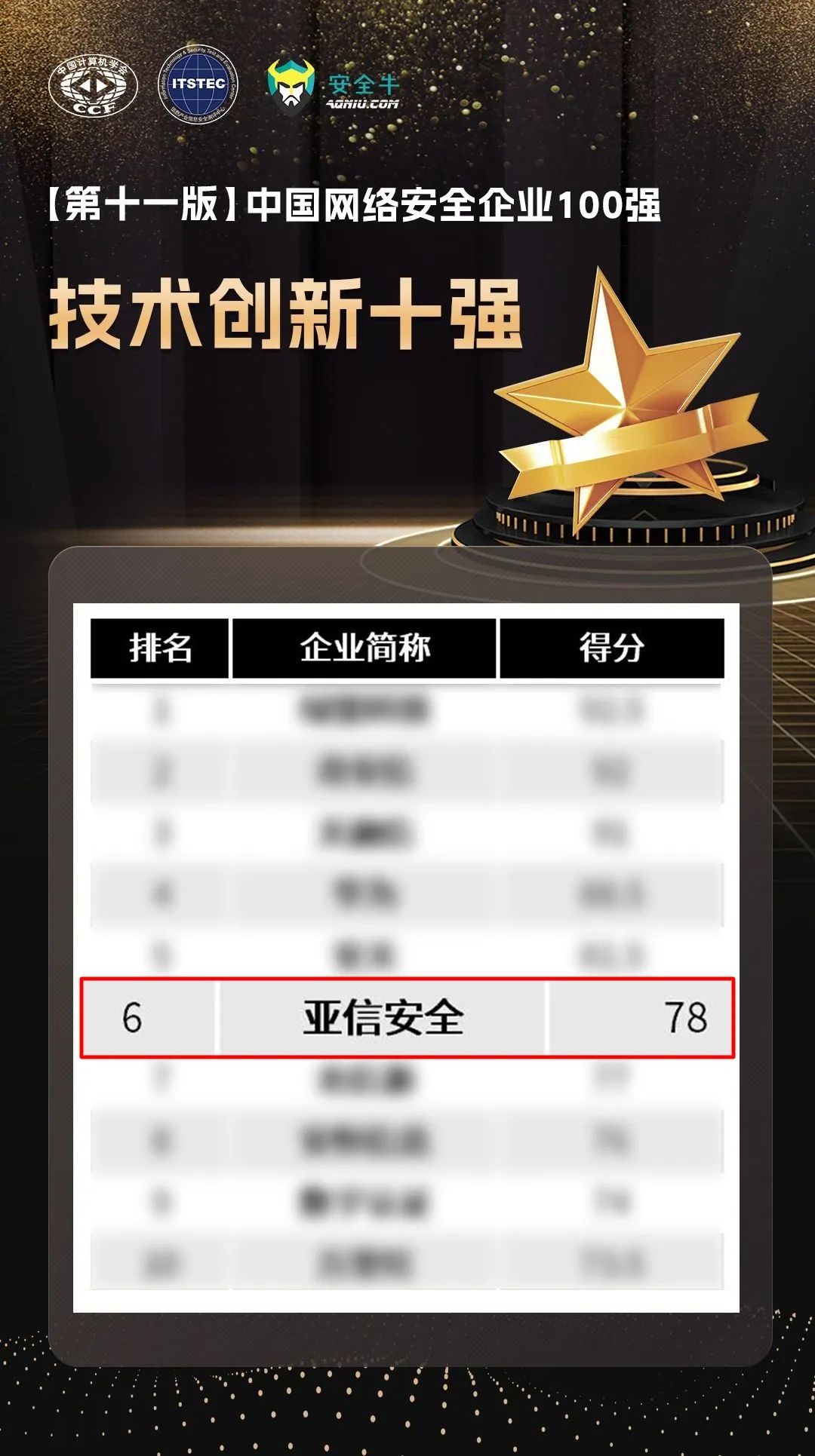 第十一版《中国网络安全企业100强》(以下简称“100强”)正式发布。亚信安全连续八年霸榜十强,强势领跑中国网络安全企业综合能力百强、技术创新能力、行业应用能力、信创能力榜单。亚信安全突出的综合实力、技术创新的引领力,以及前沿技术的落地应用成果,再次受到权威认可,“十”至名归!