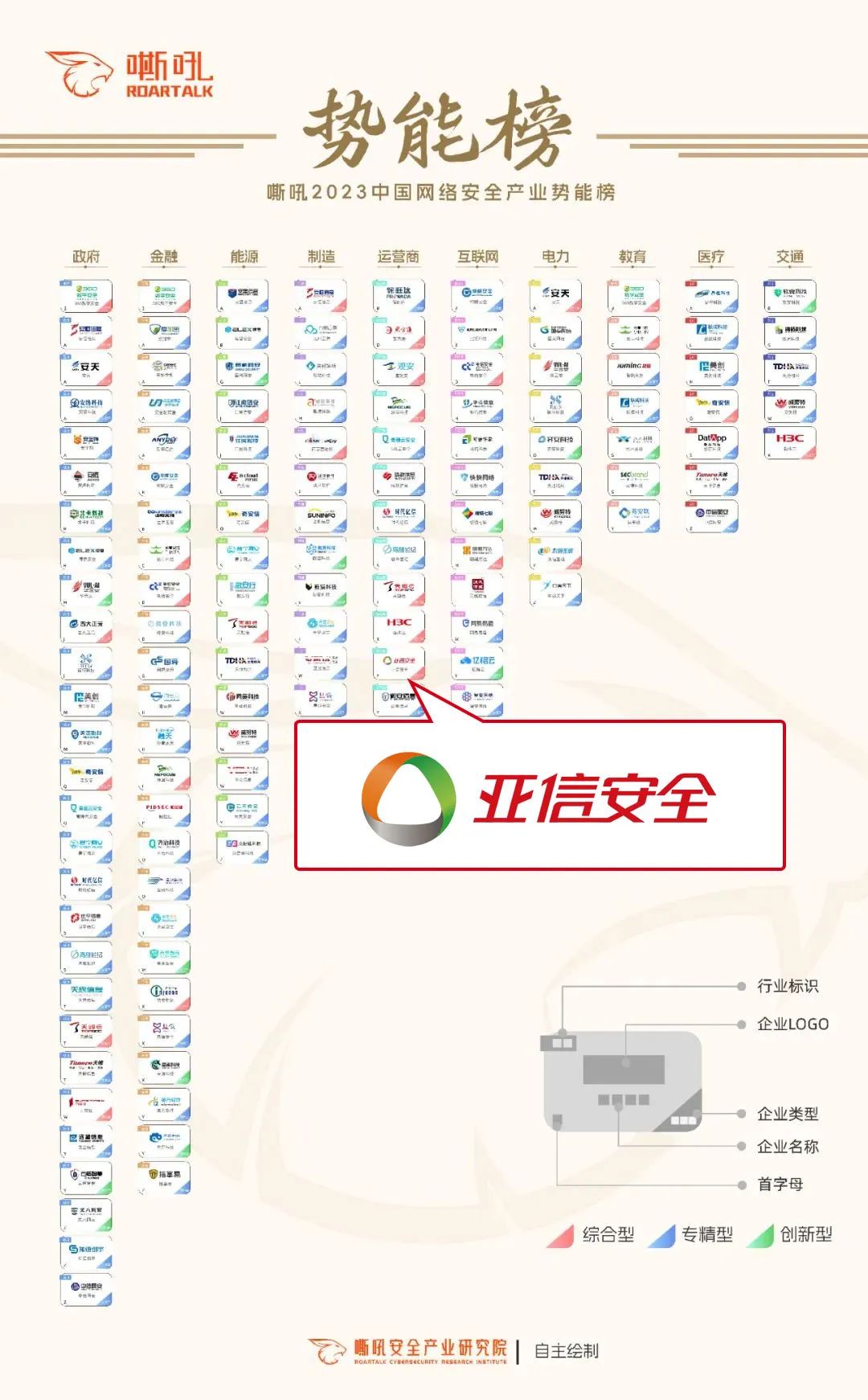 据悉,为推动网络安全产业更加健康有序深化发展,同时鼓励在本年度辛勤耕耘并持续创造价值的网络安全企业,嘶吼安全产业研究院调研发布《嘶吼2023中国网络安全产业势能榜》,并选取十大热门行业(政务、金融、能源、制造、运营商、互联网、电力、教育、医疗、交通)以及三大厂商类型(“综合型”、“专精型”、“创新型”)入围榜单。亚信安全从300多家厂商中脱颖而出,可见其在价值势能、创新势能、服务势能三个维度的显著能力获得了业内的高度认可与肯定。