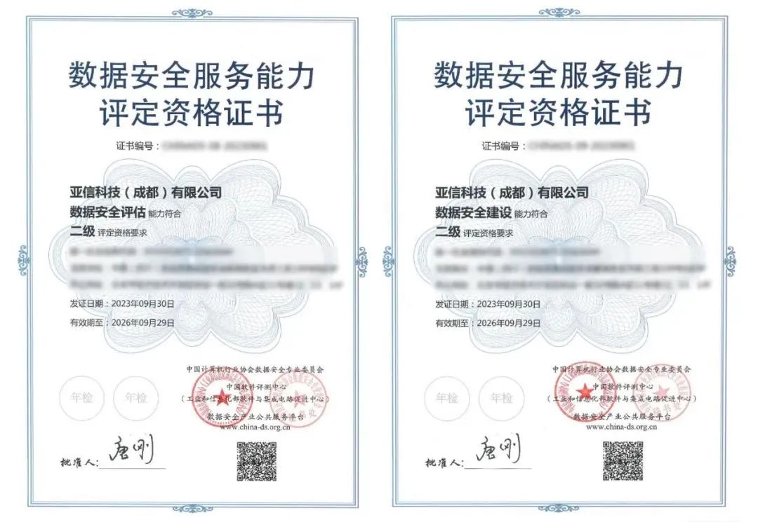 同时,亚信安全凭借在数据安全组织建设、制度流程、技术工具、人员能力和服务过程的优秀能力,获中国计算机行业协会数据安全专业委员会和中国软件评测中心颁发的数据安全服务能力评定资格证书-数据安全评估二级(最高级)、数据安全建设二级(最高级),成为目前中国为数不多的数据安全“双二级证书”企业之一。