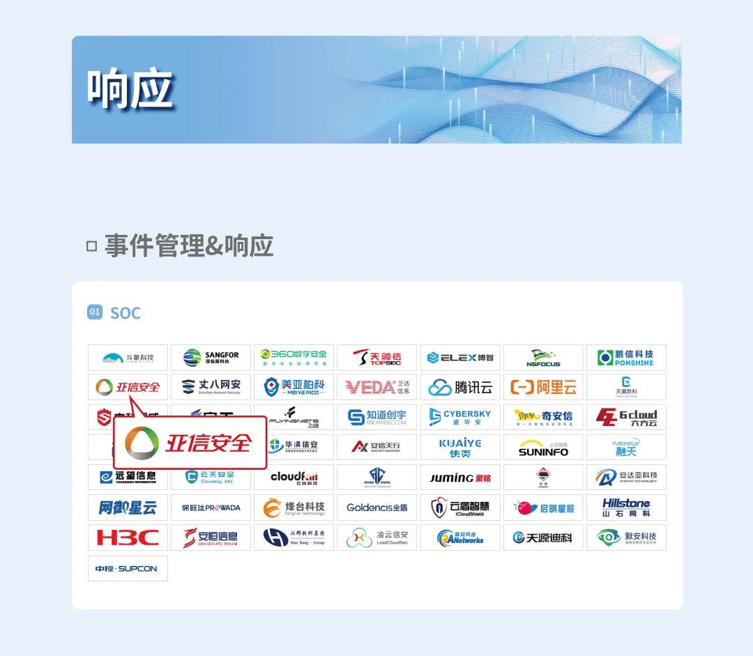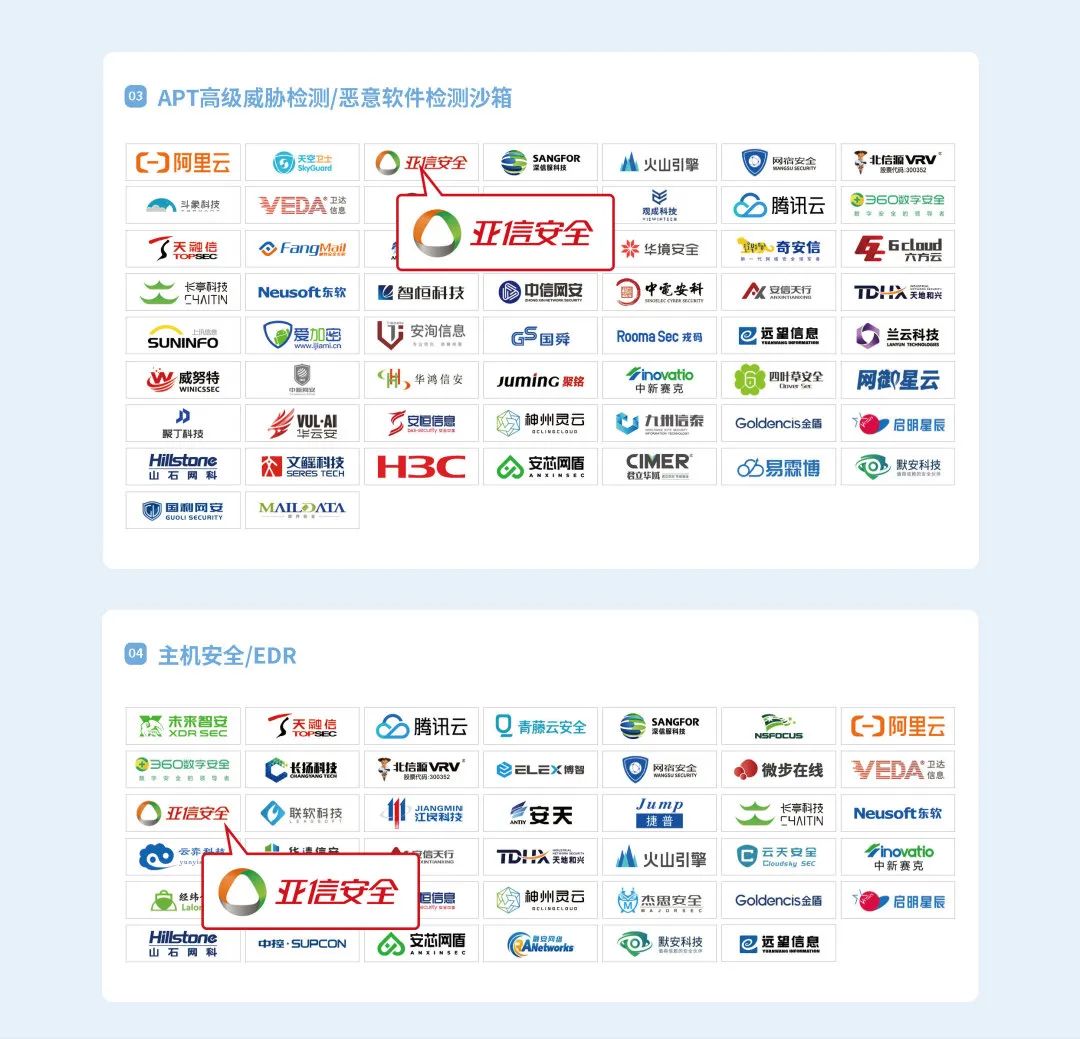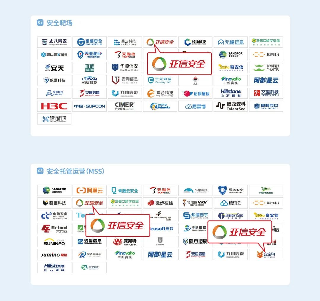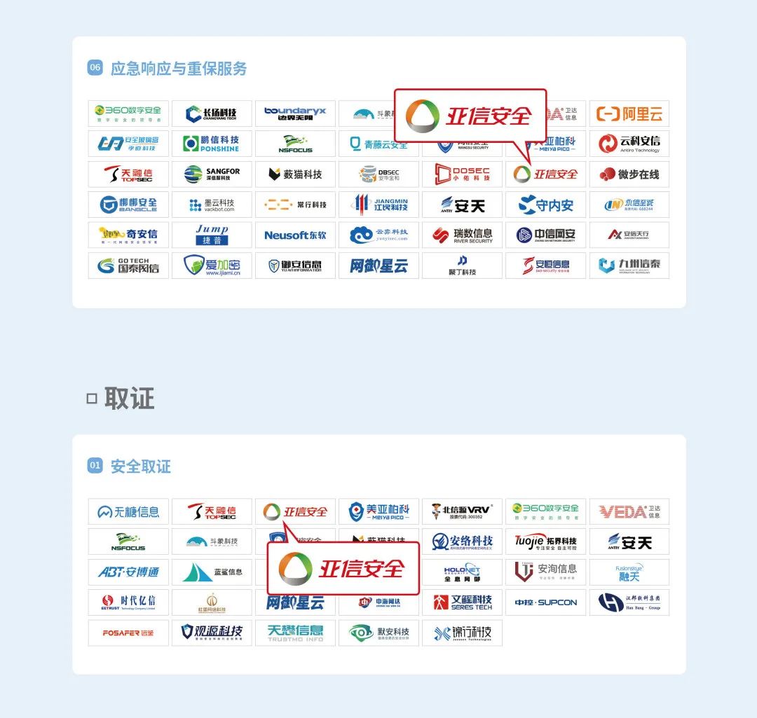 成功入选应急响应与重保服务细分领域。一直以来,亚信安全作为国家网络安全的重要支撑力量,积极参与并圆满完成了历届两会、2023大运会等诸多国家重大活动的网络安全保障工作,多次获得“突出贡献称号”等荣誉。