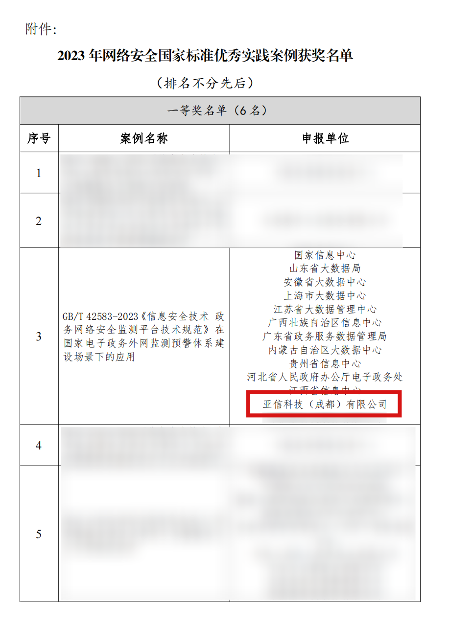 近日,全国网络安全标准化技术委员会(以下简称“网安标委”)正式发布《关于公布2023年网络安全国家标准优秀实践案例获奖名单的通知》,由国家信息中心牵头,亚信安全等多家单位联合申报的“GB/T42583-2023《信息安全技术政务网络安全监测平台技术规范》在国家电子政务外网监测预警体系建设场景下的应用”项目荣获一等奖。