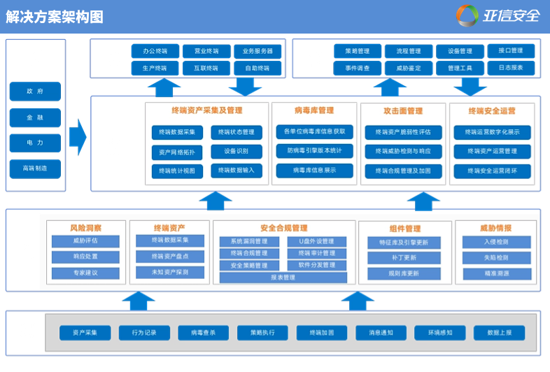 本方案围绕政府行业办公自动化和政务外网安全管控场景,旨在帮助企业降本增效,护航企业数字化建设。亚信安全新一代终端安全TrustOne创新性引入攻击面管理,并融合防病毒、EDR、零信任、桌面管控、HIPS\IDS 等终端安全原子能力,有效的消除功能孤岛。此外,聚焦高优先级待处理事件,并内置专家推荐举措,自动化响应策略,减少企业在终端安全的资源投入,让终端安全运维变得更简单。TrustOne目前已实现全栈信创环境适配。