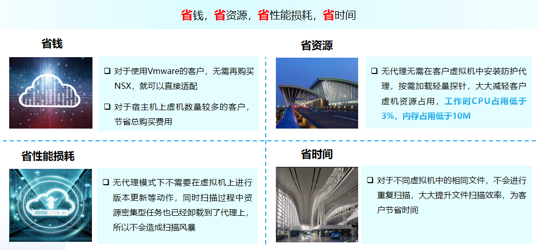 新信舱无代理版本实现了与云平台的快速对接,提供了全面的跨多云管理和深入的多层防护,从云平台,宿主机层面直至客户虚拟机,确保无死角安全。在VDI场景中,针对常见的虚拟机克隆操作,新信舱无代理优化了杀毒扫描性能,扫描效率提高了37%,CPU使用率降低了29%,显著提升了扫描速度。