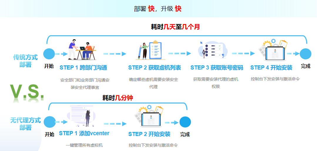 新信舱无代理版本在部署效率上实现了显著提升,能够在10多分钟内完成100台宿主机的部署并保护超过1000台虚拟机,大幅简化了客户业务部门与安全部门在安装安全软件时的沟通流程,无需收集各类虚拟机的账号和密码。这一进步将传统的部署时间从数天甚至数月缩短至几分钟,极大提高了安全防护的便捷性和时效性。