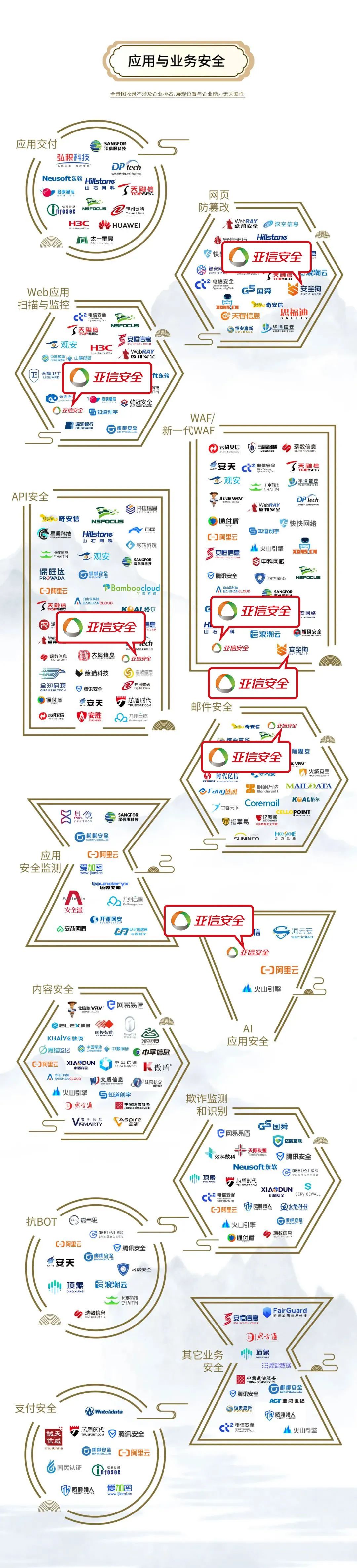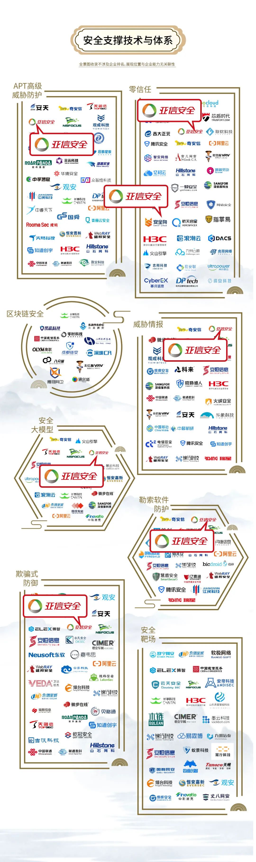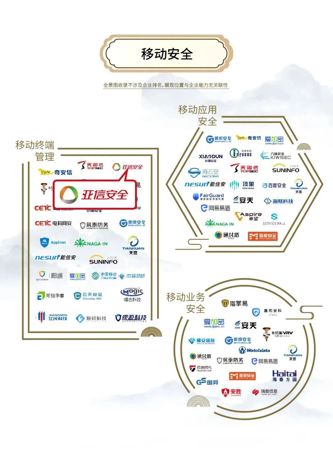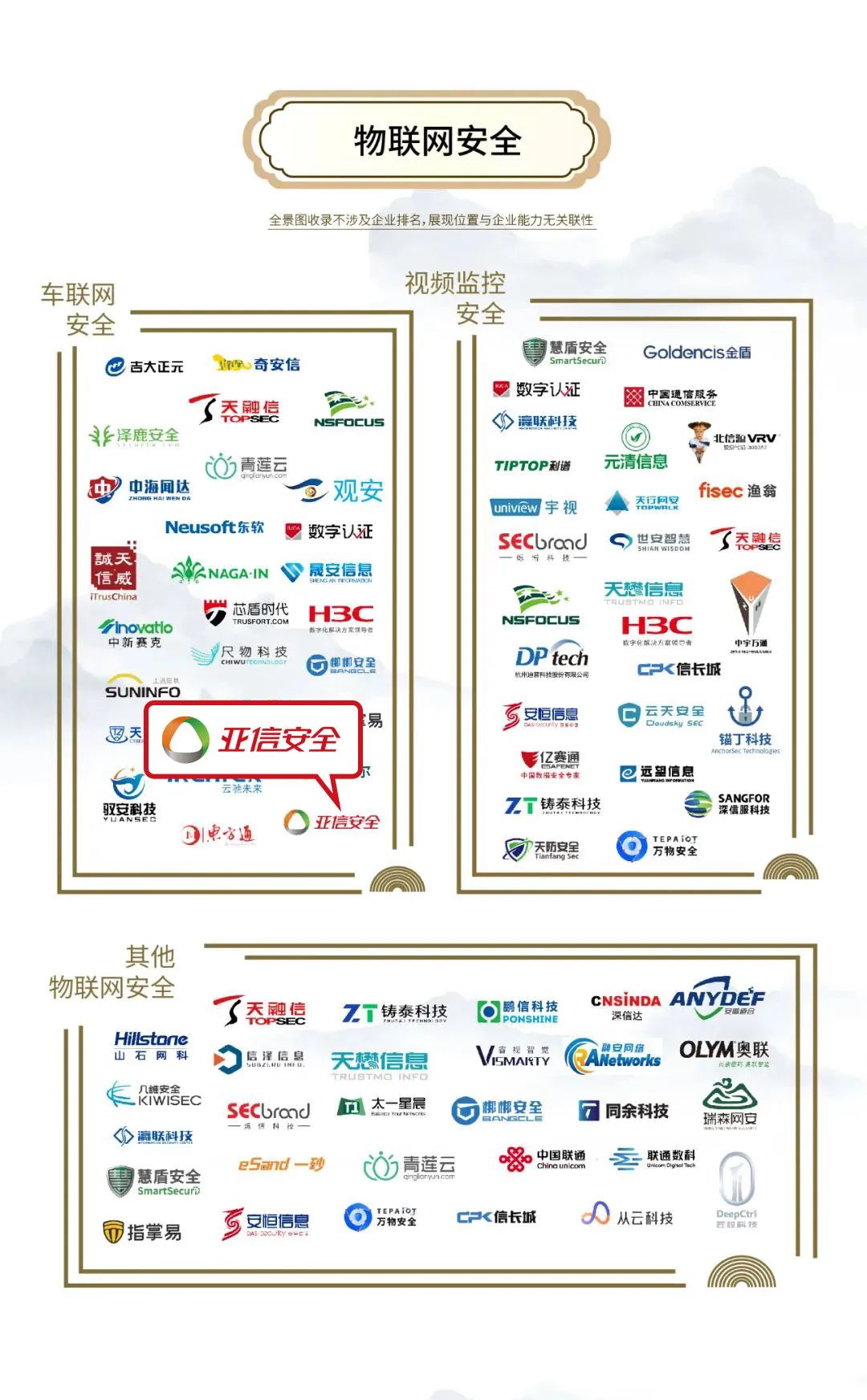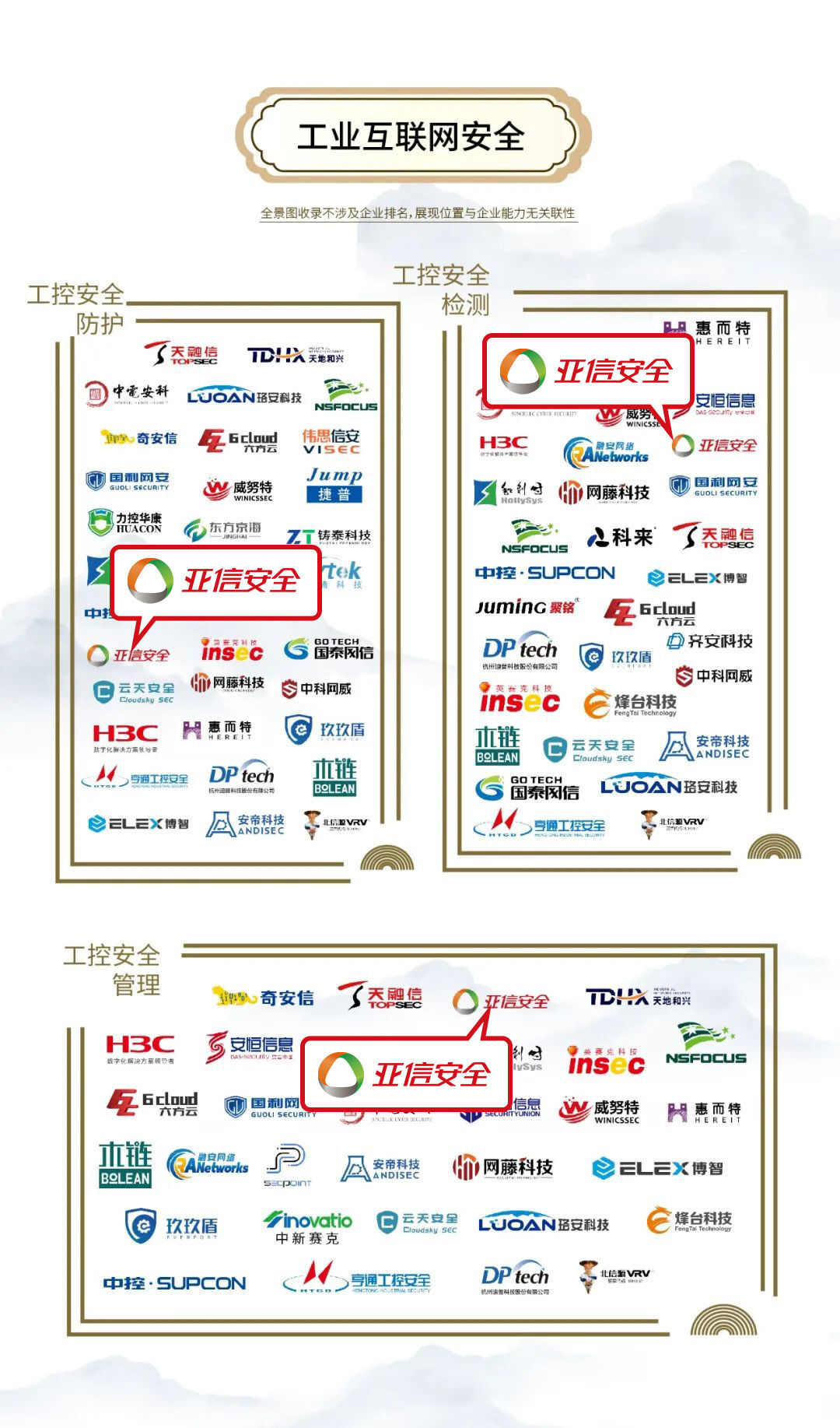 本次发布的全景图,包含16个一级安全分类,108个二级细分领域,共收录454家国内安全厂商,细分领域共收录2413项。亚信安全凭借在云安全、终端安全、数据安全、高级威胁治理、工控安全及信创安全等领域的核心技术优势,入选其中的13大安全领域,62个细分领域。