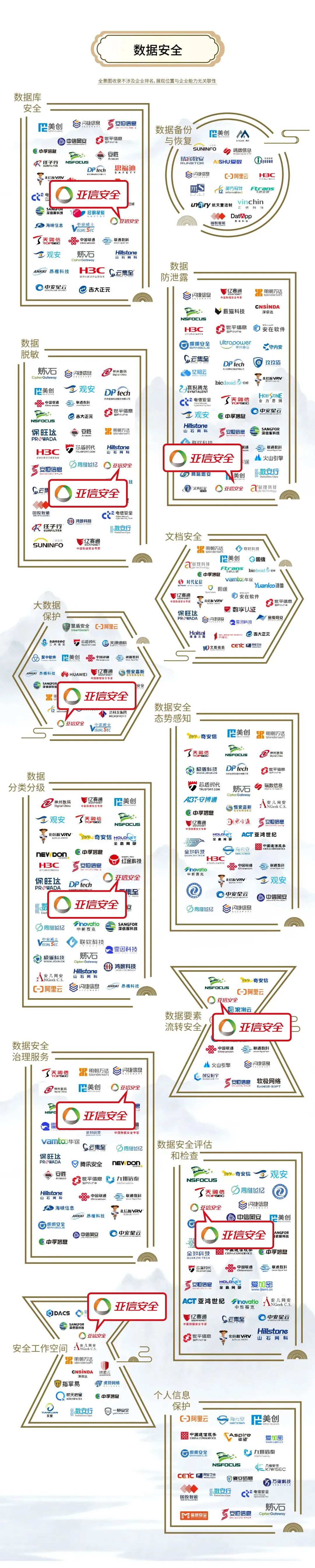 在数据安全领域,第十一版全景图涵盖13个二级细分领域,亚信安全入围“数据脱敏”、“数据防泄露”、“大数据保护”、“数据分类分级”、“数据要素流转安全”等9个细分领域;