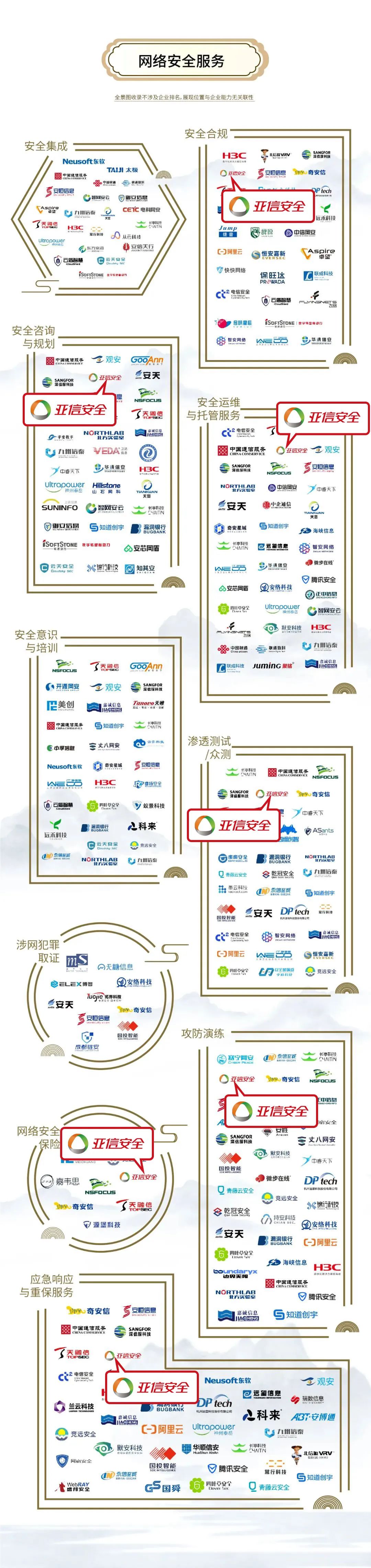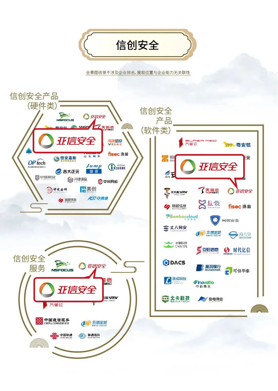 在信创安全领域,相比第十版全景图,第十一版全景图增加“信创安全”一级分类。该分类涵盖“信创安全产品(硬件类)”、“信创安全产品(软件类)”、“信创安全服务”3个二级细分领域。亚信安全凭借在信创安全领域的突出技术实力及优势,3个二级细分领域全部入选。